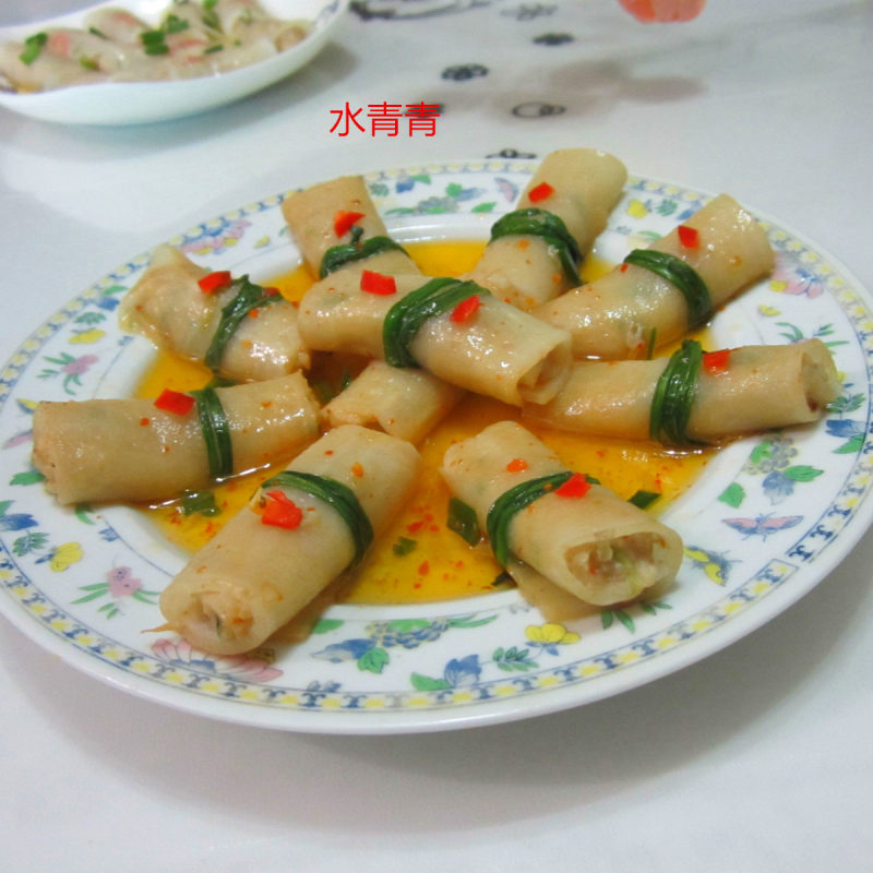 9:卷好的萝卜卷用韭菜扎紧。