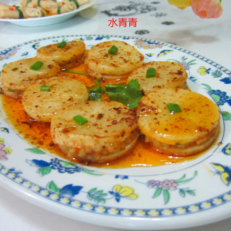 1:白萝卜切片,再拌点香葱肉泥。