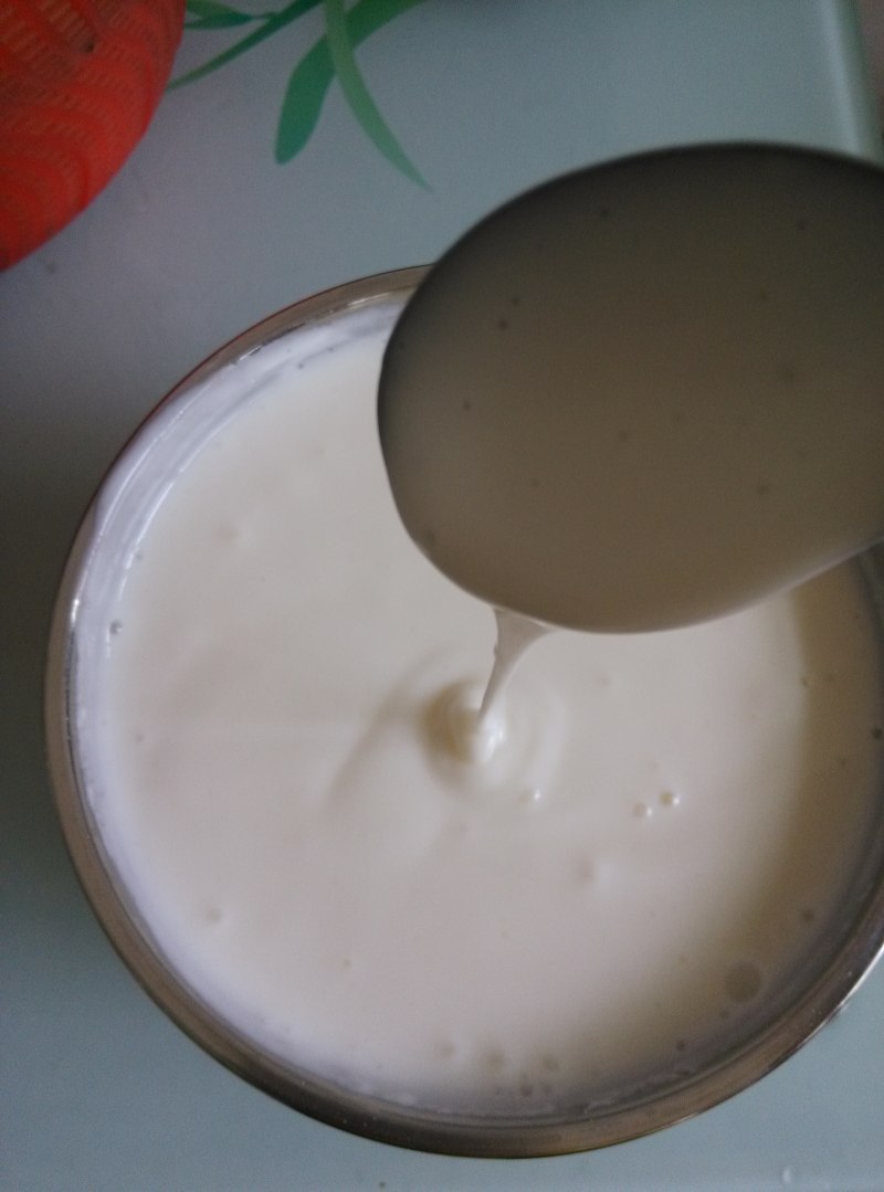 6:做好的酸奶加入白糖,搅拌均匀就可以喝了。里面可以放些水果也是特别的美味哦。成品图。