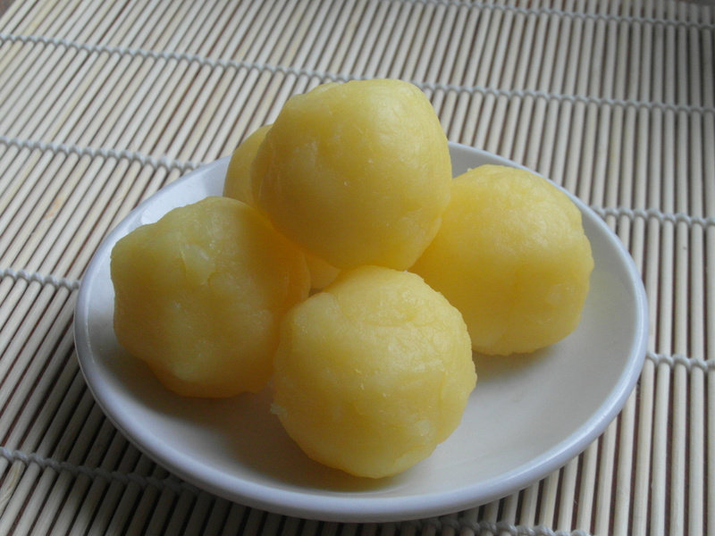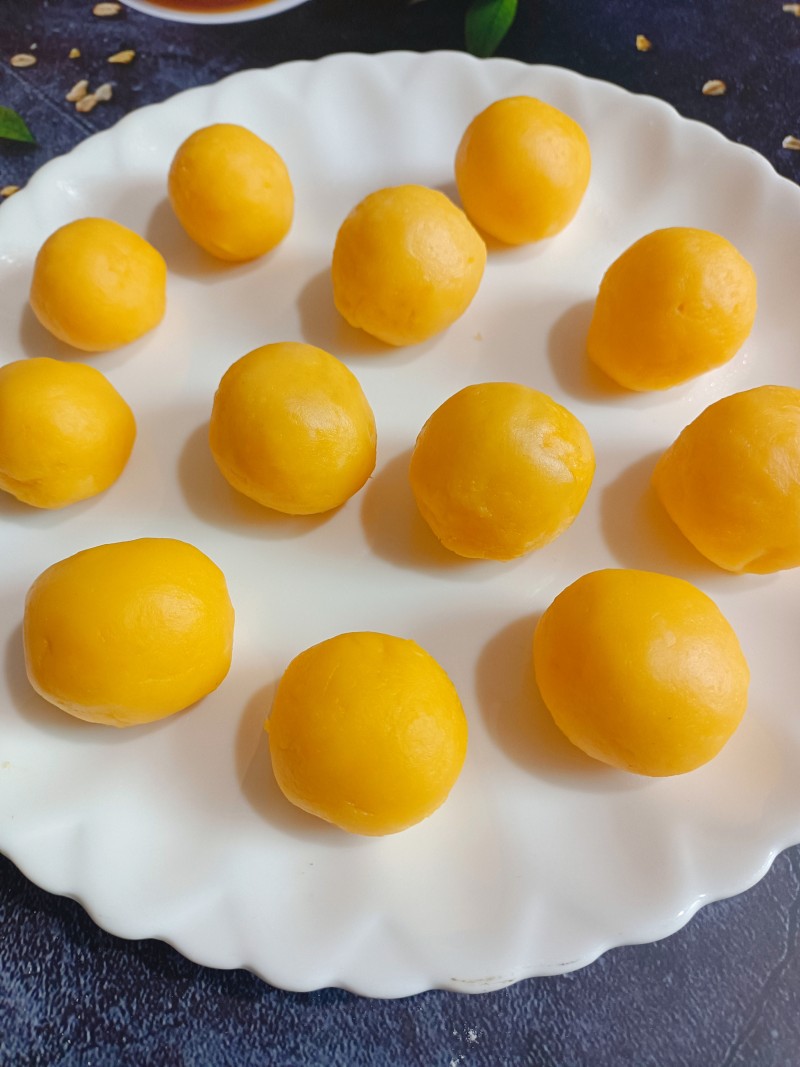 4:奶黄馅蒸熟后,拿出来晾凉备用。这个时候就可以把油皮,油酥各分成大小差不多的剂子。我没有称量每个的大小,自己吃的无所谓。第一次做的可以分油皮18克一个,油酥14克一个,要小一点的可以分油皮12,油酥8克