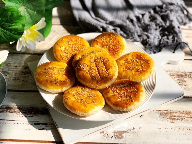 17:烤盘铺油纸,将整好形状的老婆饼均匀摆放在烤盘上,因为在烤制过程中不会膨胀,所以间距没必要太大,然后在表面刷一层蛋黄液,用锋利的小刀在表面割三刀,要把表皮划透,撒白芝麻。