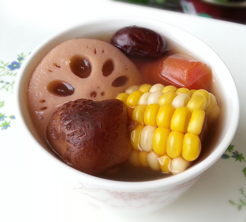 莲藕1节;胡萝卜1根;香菇3个;花生20克;红枣5个;玉米半根;姜片10克;