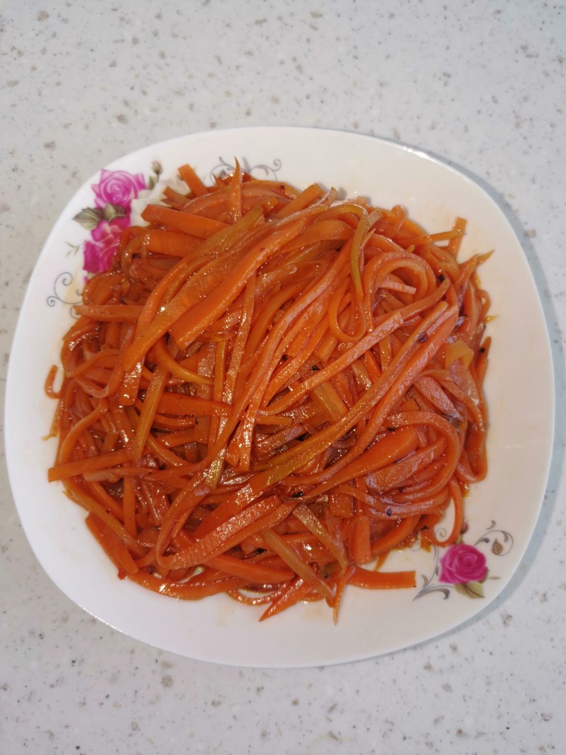 3:锅中放油炒胡萝卜丝3分钟,至发软。