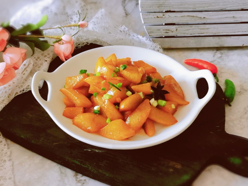 白萝卜用水焯一下也可以。这道菜是红烧,煮时间长,就没焯。