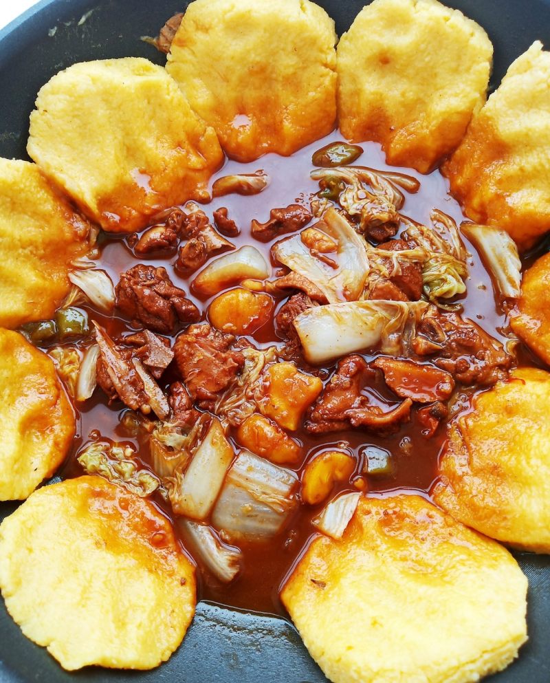10:时间到,即可完成。玉米面饼子沾上汤汁味道更不错哦。