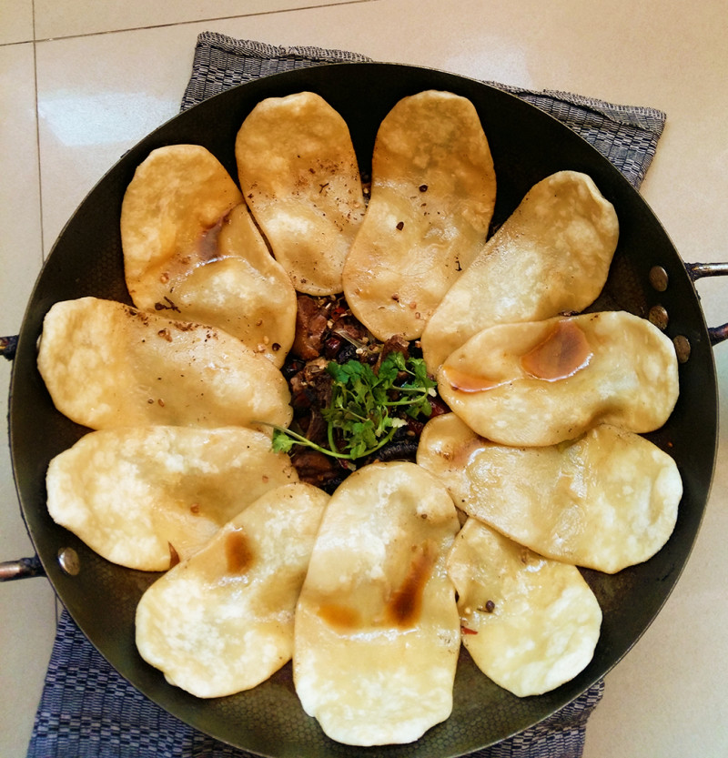 21:将面团一个一个地扯成椭圆形贴在锅沿边(主要靠汤汁将面皮闷熟)。