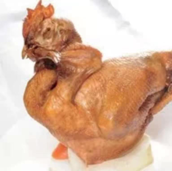 7:出锅成品。出锅时,先取下石块和铁篦子,一手持铁钩钩住鸡脖处,另一个手拿笊篱,借助汤汁和浮力顺势将鸡捞出,力求保持鸡体完整。再用细毛刷清理鸡体,晾一会儿,即为成品。