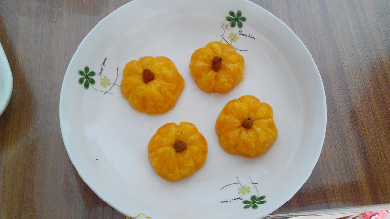 11:糯米不好消化,剩余的蒸南瓜,打成糊糊,加入面粉和安琪,发面一个多小时,蒸成了南瓜豆沙卷,又做了点南瓜形状的模子,本想蒸出漂亮的南瓜,结果蒸好后,纹路去哪儿了?去哪儿了?被老公说成蒸的是橘子!