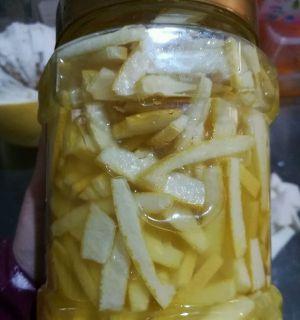 将煮熟的柚子皮放入糖浆中,加入少量的淀粉,搅拌均匀。
