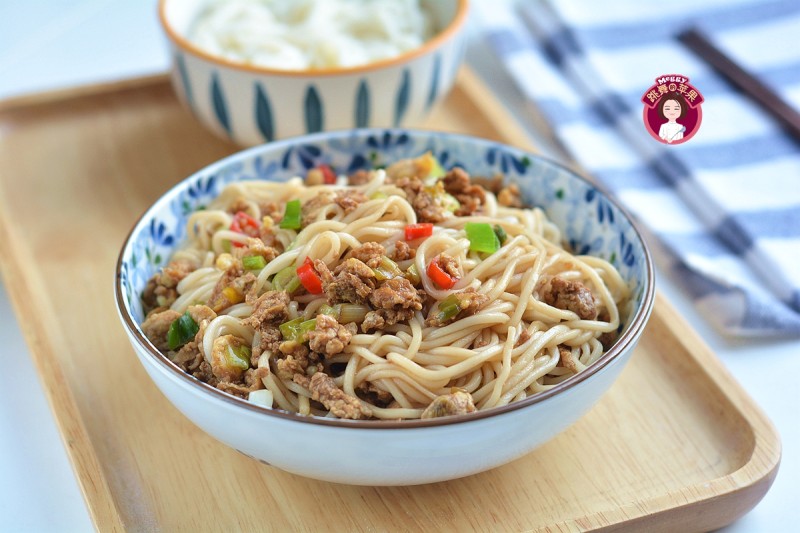 4:面条放入碗中,倒入调好的汁和开水,拌匀即可。