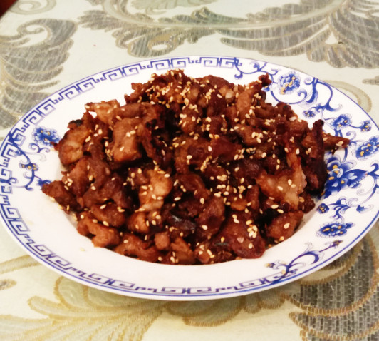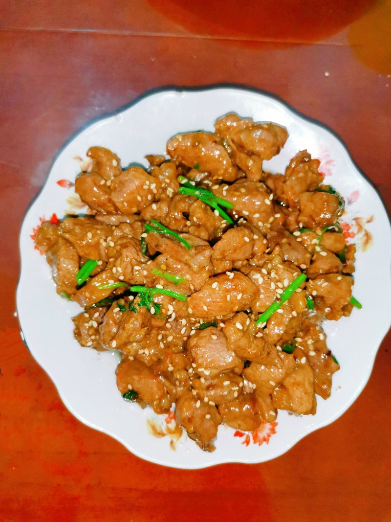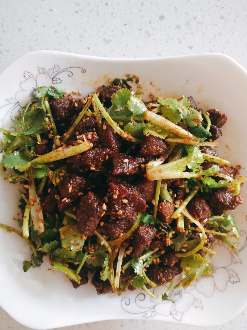 9:锅中放底油,倒入肉块煸炒,肉块变色后放入孜然粉、辣椒粉(孩子不吃辣,我做的时候没放)。翻炒均匀后放入香菜段,1勺白芝麻,翻炒均匀起锅成盘。在撒一勺白芝麻在肉上。(锅里炒的照片忘了拍照了)