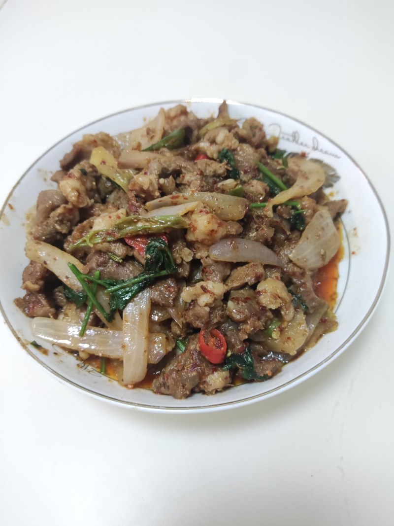 4:炒羊肉卷,因为已经是熟的,不用炒太久。
