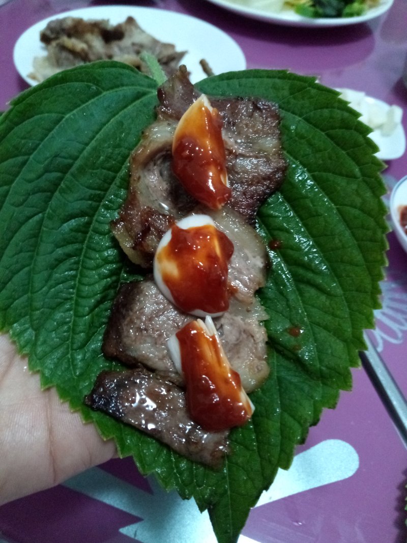 4:苏子叶上放肉片、蒜片、辣酱卷起来吃~