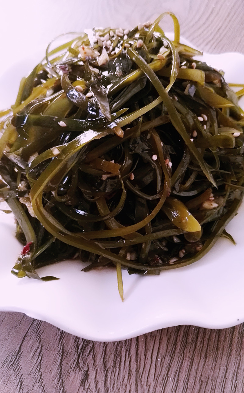 4:倒入海带丝然后放适量的醋耗油和盐炒一会差不多看到有点会褐色了就可以关火了然后放入辣椒油有白芝麻的可以放点白芝麻会更香我忘记了