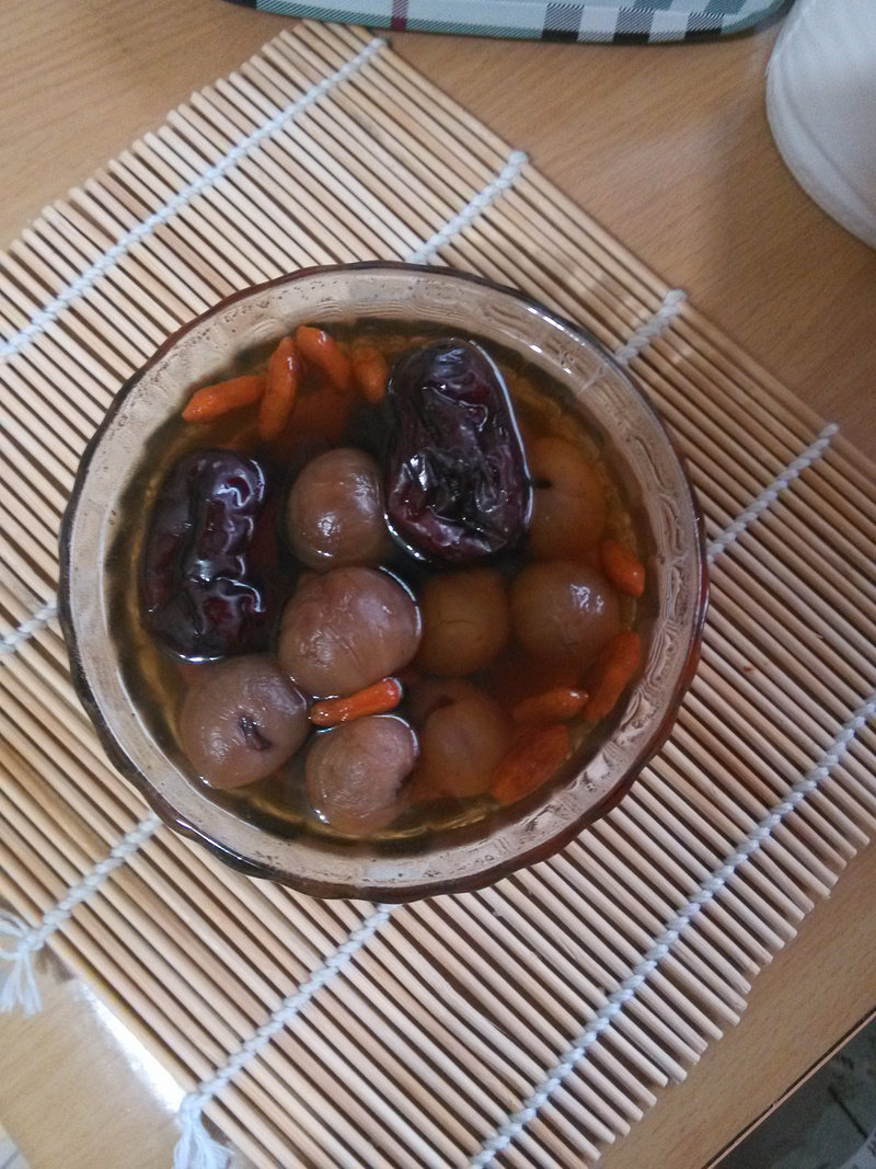 1:大红枣泡水里,用小刷子刷干净,桂圆去皮,块糖备好