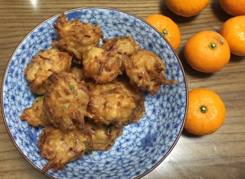 1:提前炸好的香菜胡萝卜素丸子。也可以根据自己喜好选其他口味的丸子。