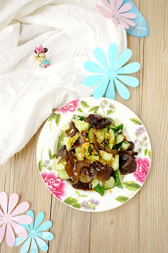 1:用料:木耳3克,黄瓜半根,醋1勺,蒜末适量,姜末适量,香油3勺,生抽2勺,蚝油1勺,盐少许,糖1勺。