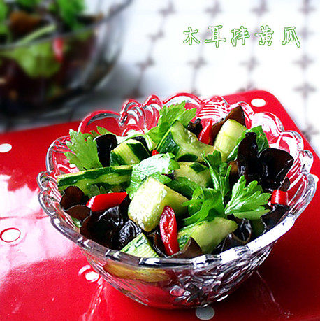 1:原料如图,黄瓜洗净,木耳发好洗净焯水过凉后备用;