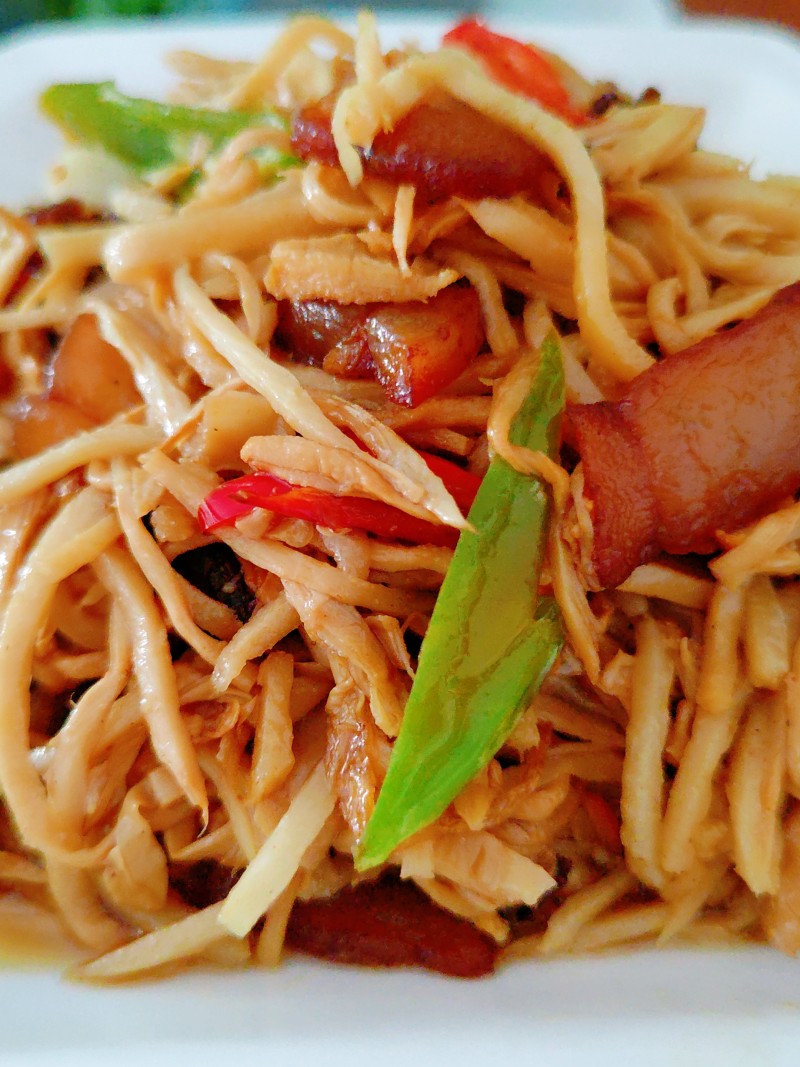 8:接着将腊肉,笋干倒入,煸炒,而后放料酒,少许生抽,腊肉本身是咸的,不要放盐了