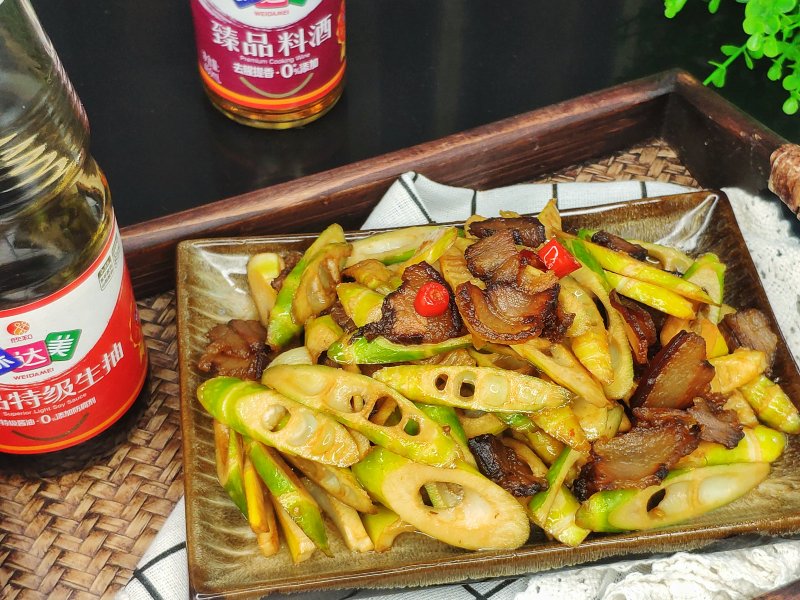 制作腊味的菜肴,最大的特点就是不要放入盐,也不要放味精,只用生抽类的调料调调味就行了。喜欢辣味的,可适当放些辣椒酱。