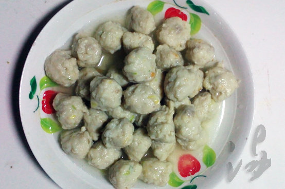 12:舀入的量以锅的容量为尺度,然后开小火,让水温慢慢上升,但千万不要让水煮沸,最高达到90度即可,小火慢慢把丸子浸熟,待丸子都飘起来,稍微等上半分钟,就可以把丸子捞出了