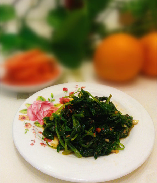 7:沥干水分装盘,把调匀的蒜汁浇上,拌匀即可食用