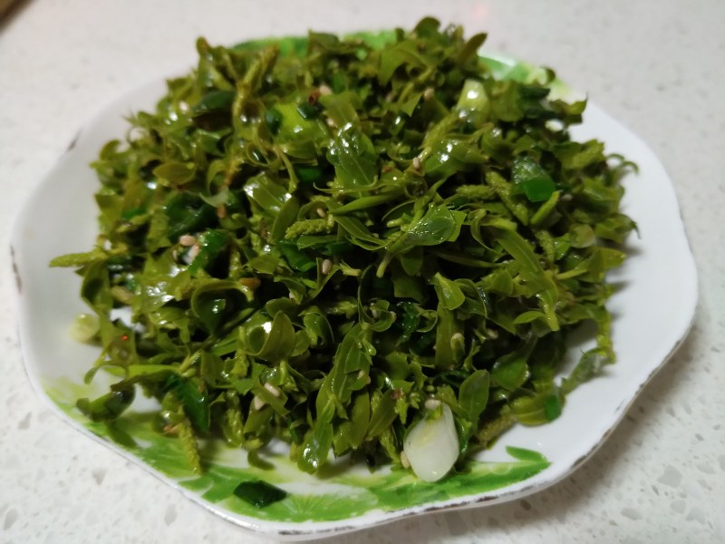 4:泡好的柳叶捞出,挤干水分,放入少许盐.白芝麻和蒜苗,热油浇,散发出清香味。