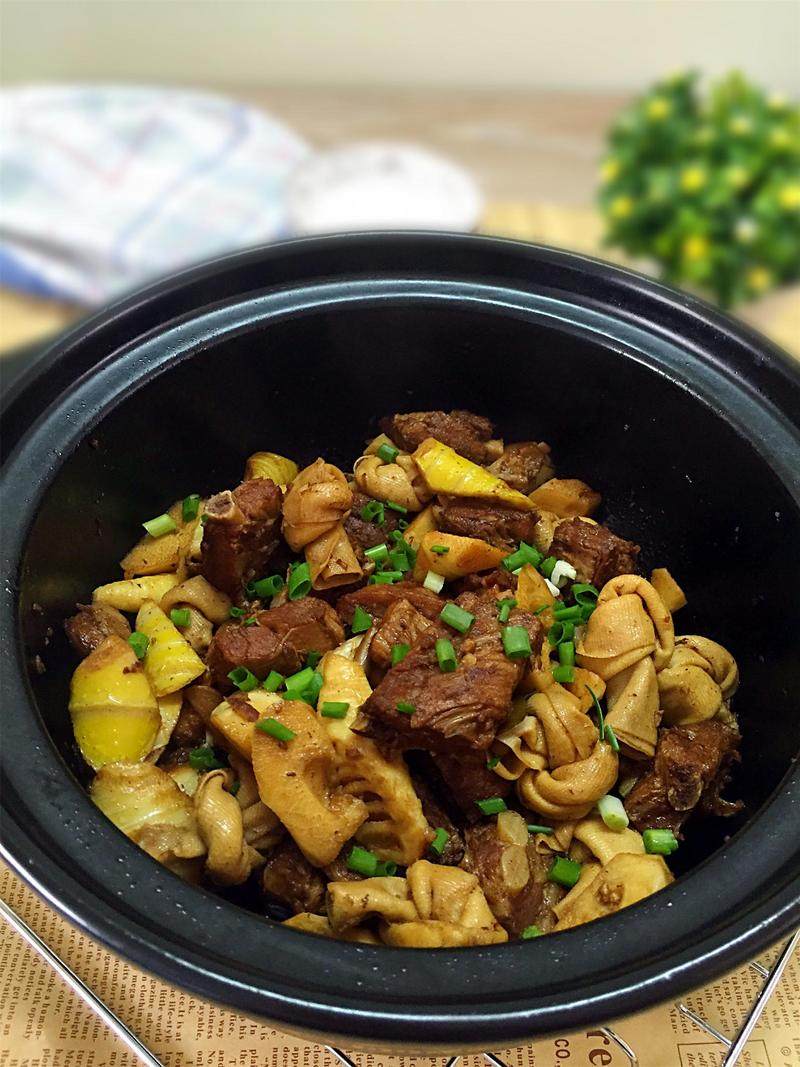 7:等排骨酥烂后放入百叶结、春笋煮开,放盐