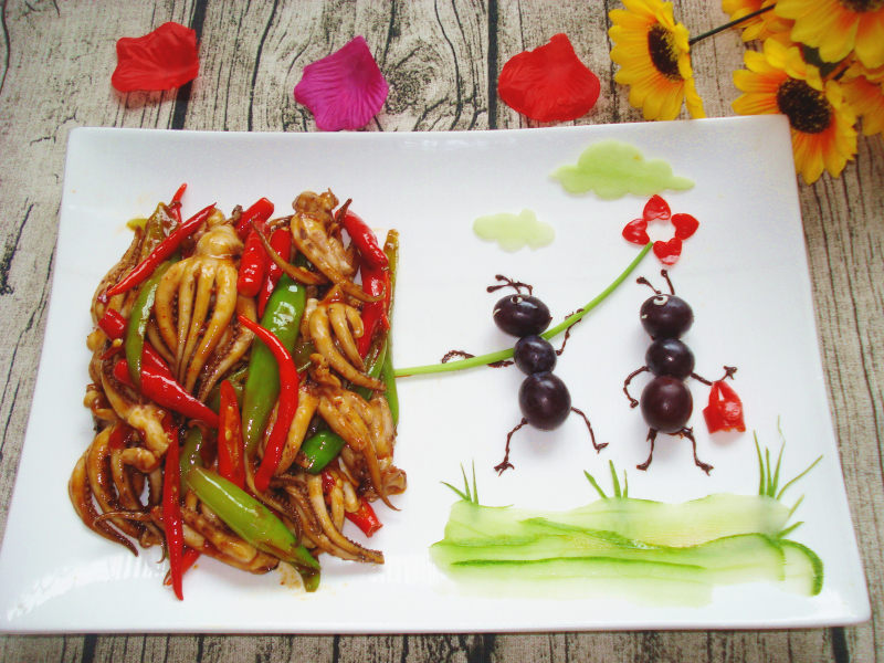 12:倒入鱿鱼,翻炒两下。