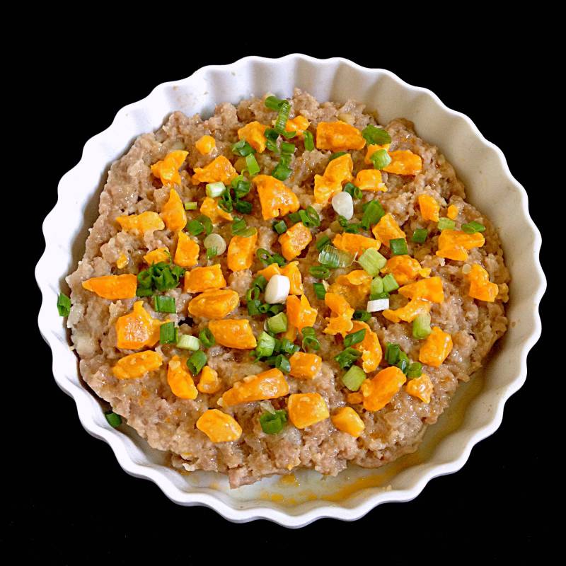 6:咸蛋黄切碎,均匀的洒在肉馅表面。