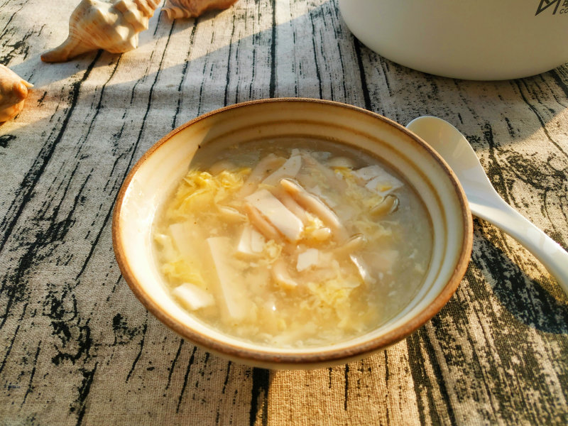 1.倒入鸡蛋液时,不要立刻搅散,凝结一会儿再轻轻推动,可以做出漂亮的蛋花。2.煸炒白玉菇可以使用任何植物油。