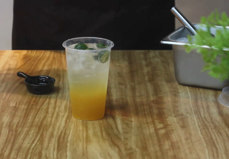4:接下来准备一个出品杯,加入茉莉蜜桃酱。