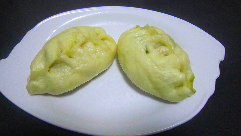 4:擀开皮包入南瓜馅左右捏,这样包子馅放得多。