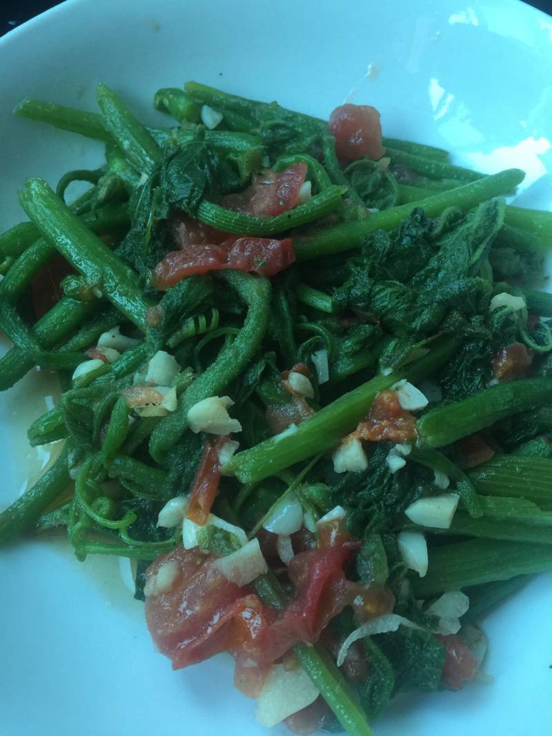 5:放油烧热后放入蒜炒香,加入瓜叶翻炒。