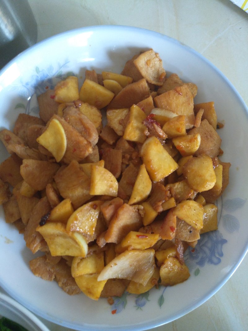 2:鸡胸肉翻炒7分熟,加入茭白丁继续翻炒,加入辣椒酱至熟透