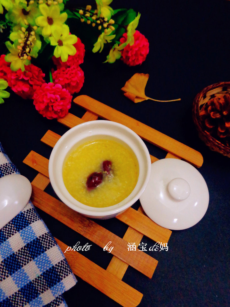 小火煮期间有时用勺子搅拌一下,不然会有点粘锅(这个粥合适长牙一岁多的小孩:不长牙的小孩也可以吃,不过玉米红枣要比大米提前煮,那样就会烂)