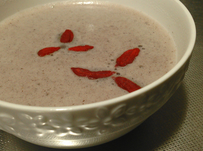 5:25分钟,紫米黑豆豆浆就打好了,摆放上几颗枸杞子做装饰