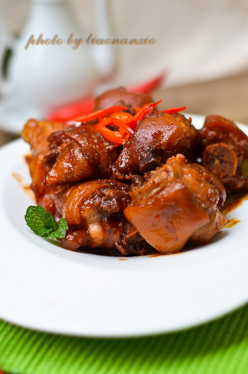 猪蹄味重,焯水时加一点盐,料酒要稍多些。将焯过水的猪蹄过一下油,烧出来口感很好。红曲粉的作用主要是上色,没有可以不加,单单用酱油或者糖色都是可以的。此菜炒后可以用高压锅,比较省时间。