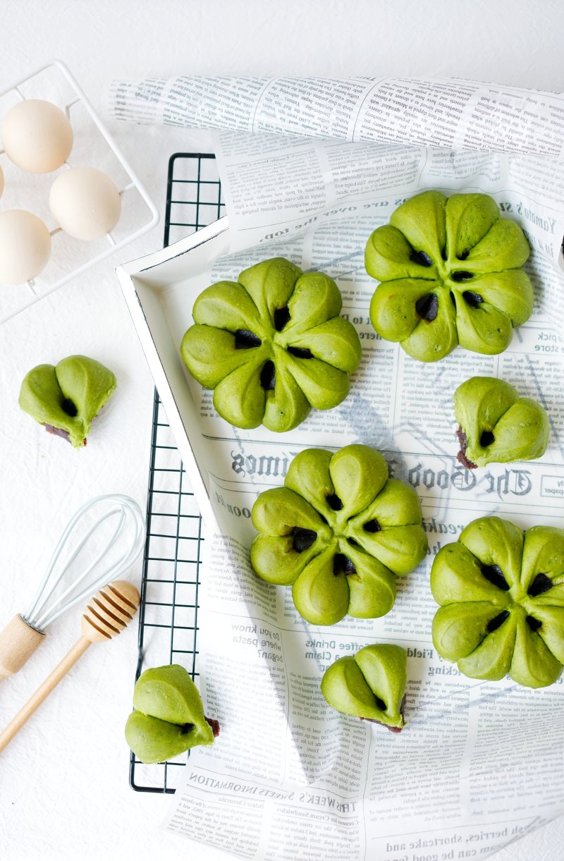高粉250克;抹茶粉15克;细砂糖50克;盐3克;全蛋液50克;牛奶205克;酵母3克;黄油35克;
