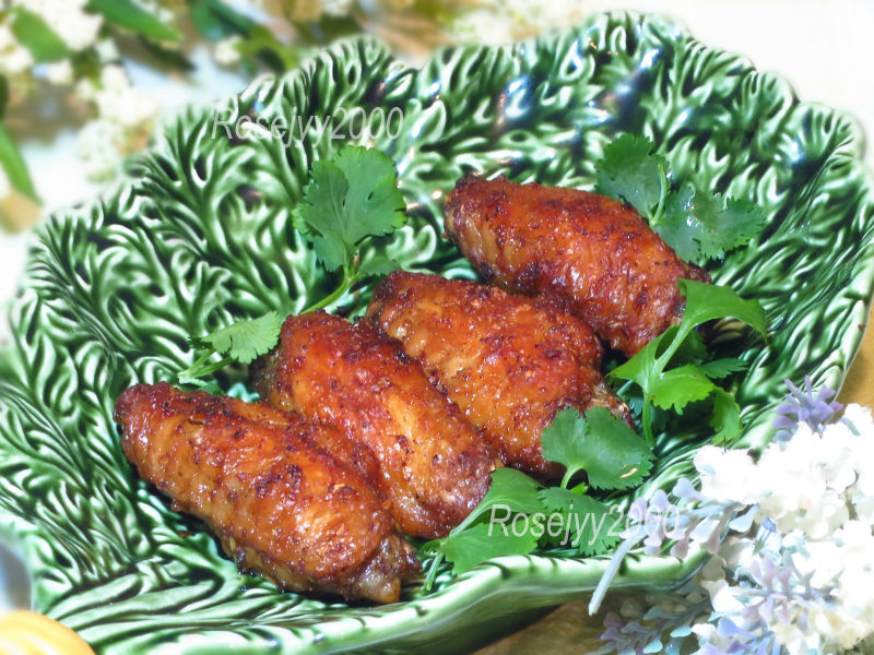 1:把鸡翅治净,在翅膀的背面划两刀深至骨头,然后放在容器里,加上花椒粉1汤匙、辣椒粉Cayenne1/2汤匙、辣椒粉Paprika1茶匙、胡椒粉1/2茶匙、盐1茶匙、生抽1汤匙、细砂糖1/2茶匙和白兰地(料酒也行)1汤匙,抓匀,如果不急着用,放冰箱一夜,如果即日用,静置我15分钟;