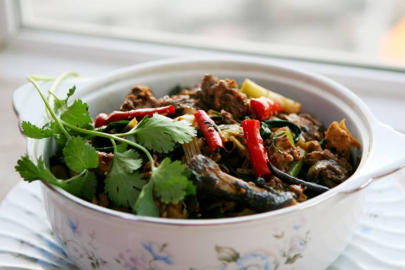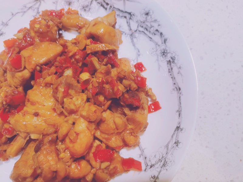 8:最后倒入炸好的鸡肉翻炒均匀,炒的时候可以尝一下鸡肉的口感,适当地加少许盐调味。