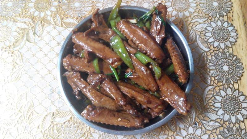 8:半熟的辣椒再放下刚才待着的鸭翅一起炒