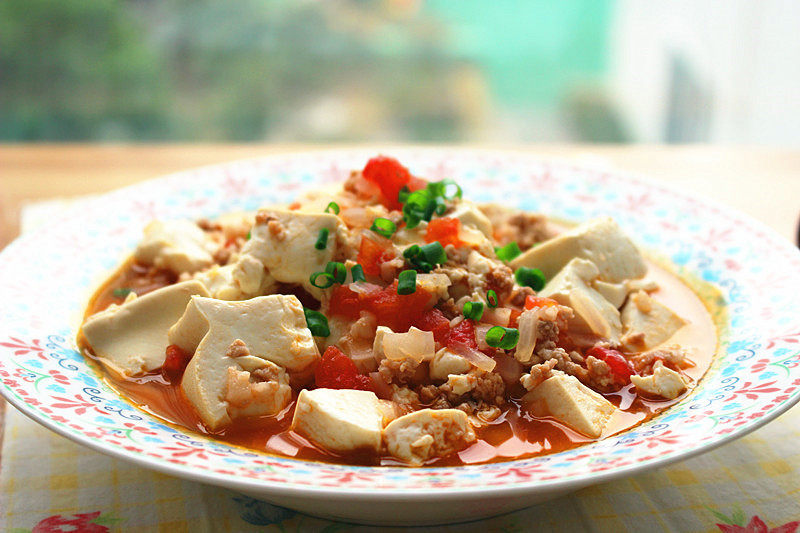 嫩豆腐2块;肉末适量;西红柿1个;洋葱半个;