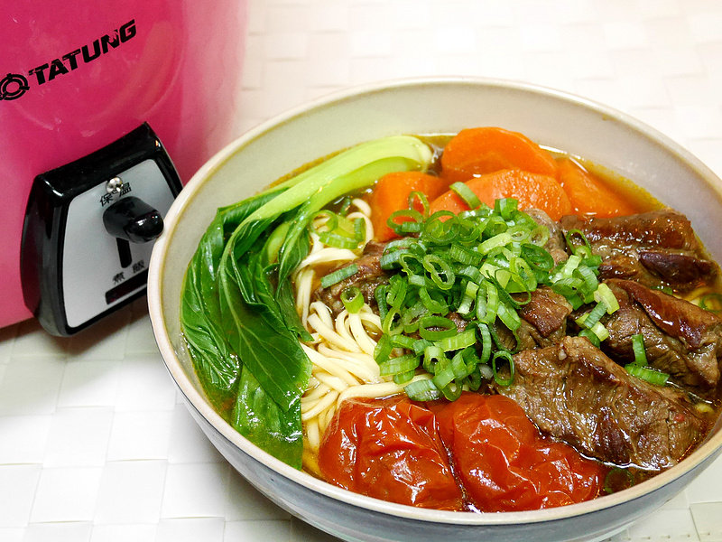 6:【开始炖牛肉】取一内锅,放进步骤5完成的炒料、牛西红柿块、红萝卜块、八角和清水。(外锅)倒进2米杯水量,按下开关,炖煮约45分钟。开关第一次跳起时,(外锅)再加进2米杯温水量,待开关再度跳起,即依个人口味喜好,酌量添加盐巴调味。(耗时约90分钟)(希望更软烂,可再重复1次)加点面条,加点青菜,美味满分,营养满分