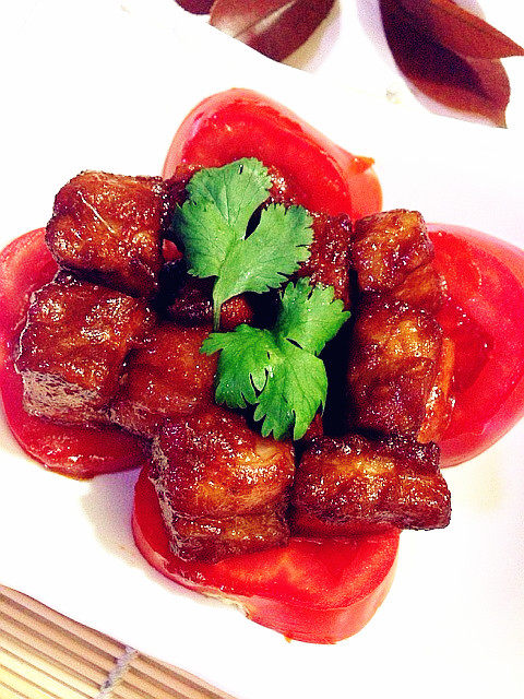 这道菜的重点是做好之后配上生的番茄,这样维生素也有了,番茄红素也有了,不仅看着好看而且吃得时候还不腻