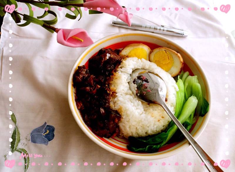24:盛一碗热乎乎的米饭,挖一大勺带着肉酱的卤肉,加上小青菜和卤蛋,完工。