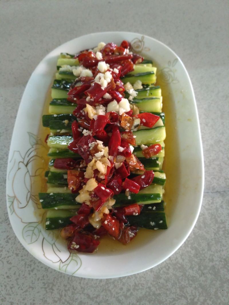 6:拌好放一二分钟让它入味,码盘,最后把干辣椒码在上面,(好看)再浇点汁青瓜上即可。