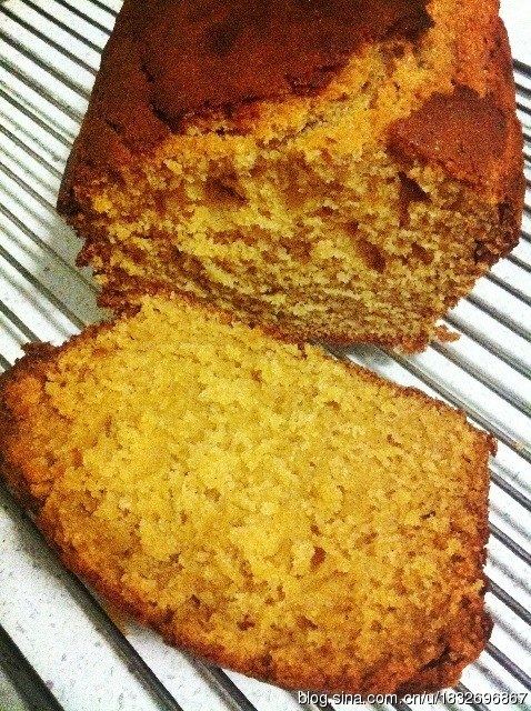 6:放入预热好的烤箱,烤50分钟左右。用一长签轻叉入蛋糕内部,如果没有面糊黏着,即熟透。拿出烤盘,放在铁架上5分钟,脱模,待完全放凉,即成~
