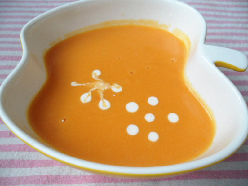 7:待南瓜糊冷却后,用小勺蘸取少许淡奶油,滴落在南瓜糊表面;
