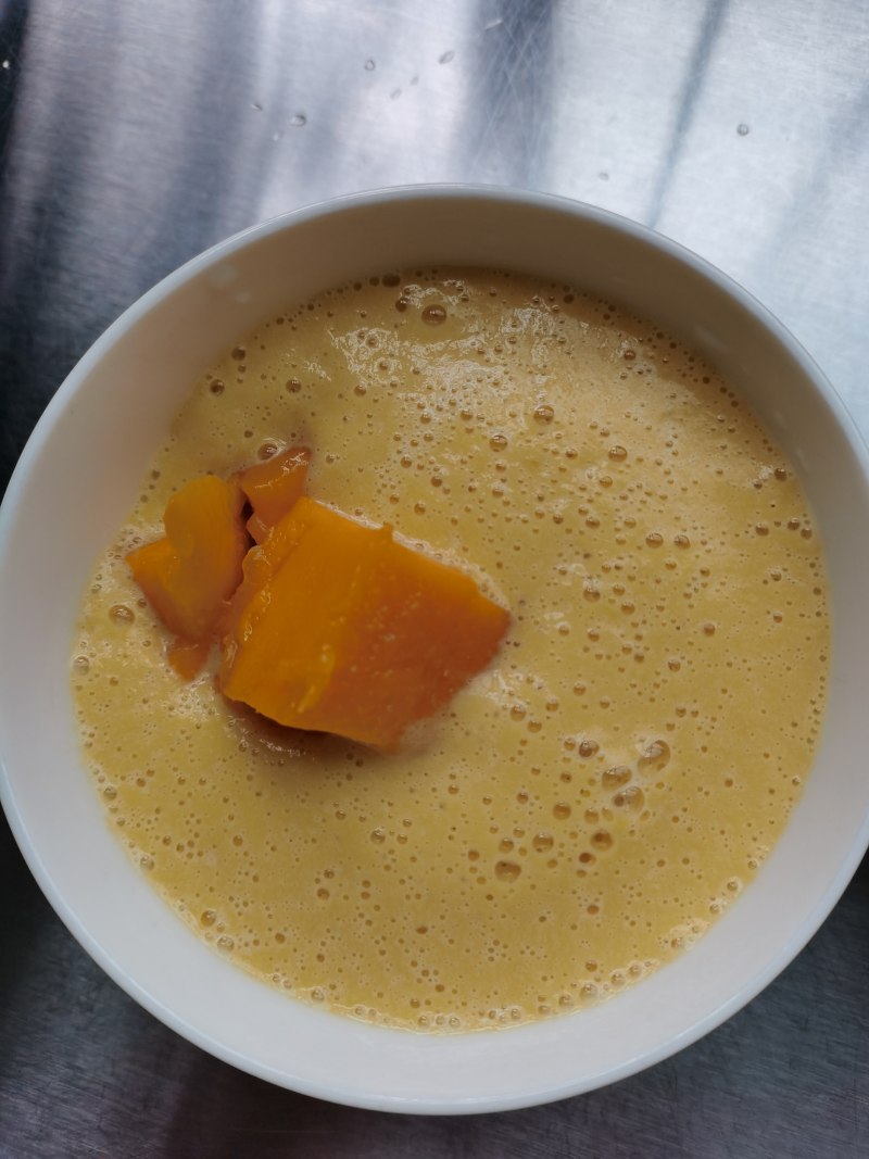6:南瓜和芒果放进搅拌机。注意我的是普通搅拌机,不带加热功能的,所以南瓜要是凉了才能放。总破壁机也可以的,我破壁机放新家,宿舍只有这个!